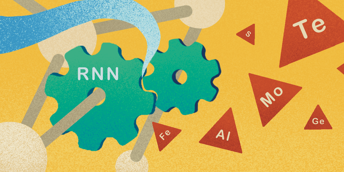 A machine learning model, called a recurrent neural network (RNN), is being used to predict a better polymer structure with high energy storage capacity. A polymer structure is fed to the RNN model (the green gear), resulting in a list of polymer structures which likely have better energy storage capacity (the red tetrahedrons). Illustration/Chris Kim
