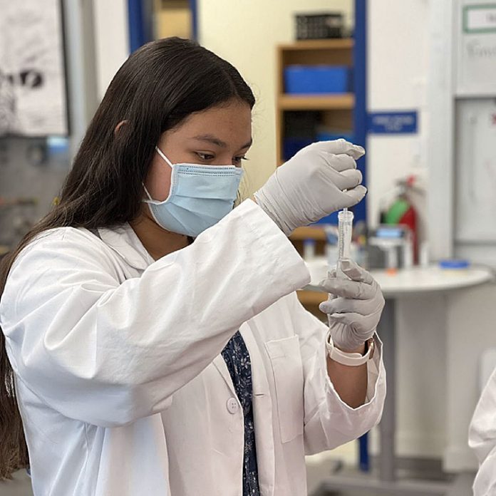 Scholarship winner Briseida Gonzalez, from Soquel High Biotechnology, measures alcohol into containers for a cheek cell DNA lab.